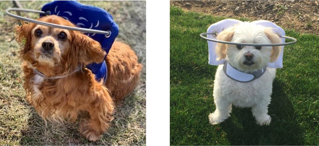 Muffin’s Halo Guide is designed to help your blind dog navigate their surroundings, complete with a stiff neck board behind their neck, which holds the halo consistently in place. The Halo is positioned just above your dog’s eye level to act as a buffer to protect their mouth, nose and shoulders from hitting surfaces and it also acts as a signal to your dog to allow them to walk with confidence.