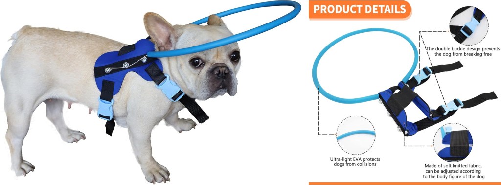 The HQSLC Blind Dog Halo Guide comes attached to a vest harness so your pet can wear it easily, and the double buckle design can prevent the dog from breaking free. This product is made of soft knitted fabric and ultra-light EVA. Wearing this is almost no weight for your dog.