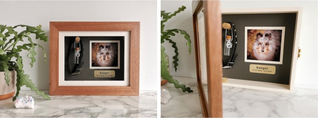 Pet Memorial Shadow Box Frame Personalised Keepsake – Handcrafted made with love and care from the finest quality solid woods – all hand-picked and expertly worked, to give you the finest tribute to you dearly loved pet. A truly bespoke frame should you wish to display paw prints, your pet’s favourite toy – or keep it more minimal, with a simple Oak collar hanger.