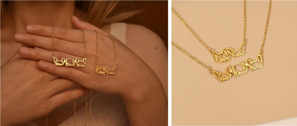 Dog Name/Ears Necklace Capture the essence of your beloved canine companion with one of our custom dog necklaces with personalised names. A unique and authentic way to keep your dog with you wherever you go, it’s a must-have for dog lovers. Wear your dog’s name on your heart and always celebrate the joy your furry friend brings to your life.