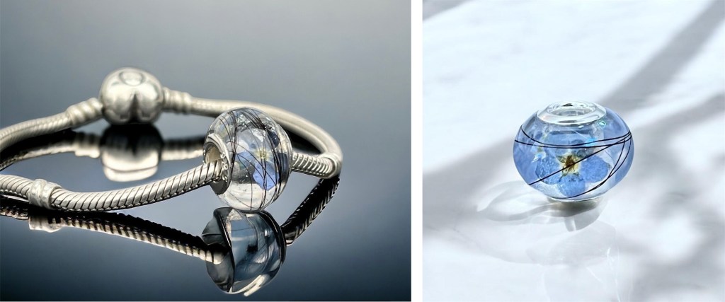 Forget Me Not Pet Hair Resin Bead – Beautiful keepsake for your pet. Custom made with your own pet’s hair provided by yourself, and customised with Forget Me Not flowers and glitters. 925 solid or plated silver – Pandora Style.