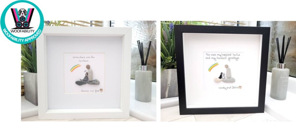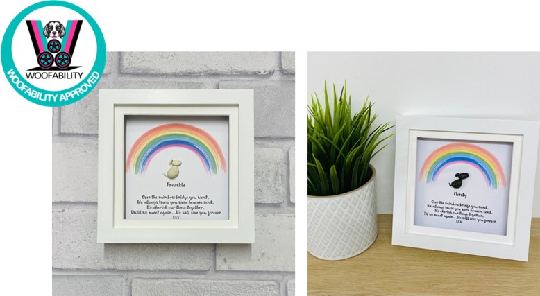 Pet Memorial Framed Pebble Art Picture – A perfect keepsake gift, completely bespoke and handmade to order, pet loss Rainbow Bridge Frame, designed using pebble art and watercolours to create a beautiful memory.