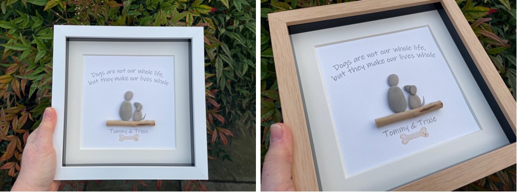 Personalised Dog Pebble Art Memorial – This special picture to celebrate the bond between someone (or more) and their dog has been designed using natural pebbles and driftwood on a textured ivory background. Each picture is handcrafted just for you and is unique due to the natural varying shapes of pebbles and driftwood.