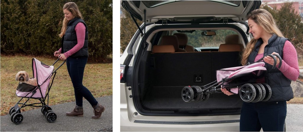 The Pet Gear Travel Lite Pet Stroller comes with large 6″ wheels for easier strolling. Lightweight, fully assembled and portable, only 9lbs. Folds into an ultra-compact size in seconds.