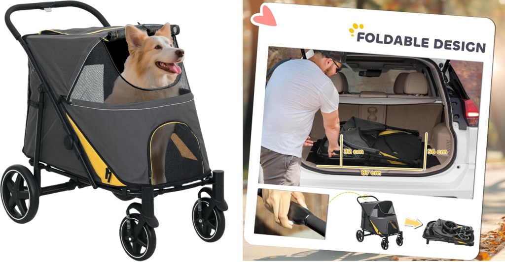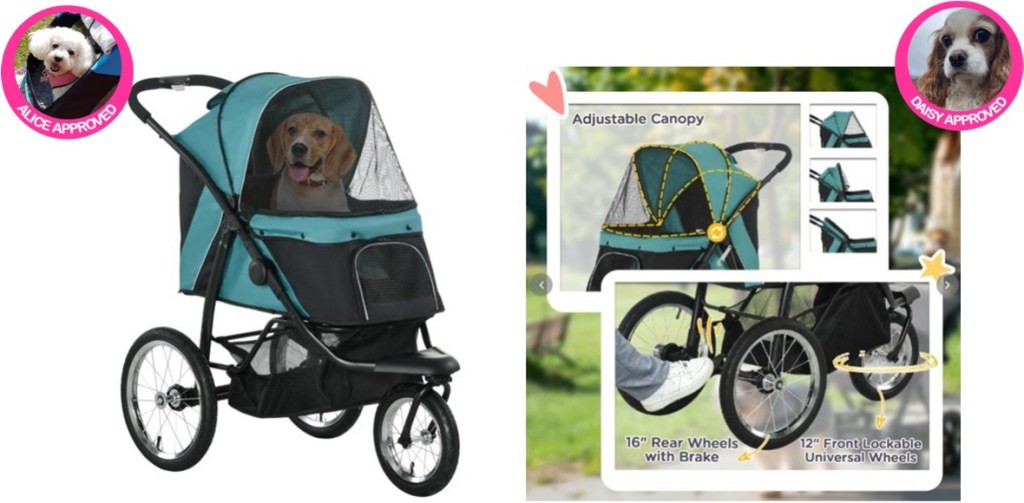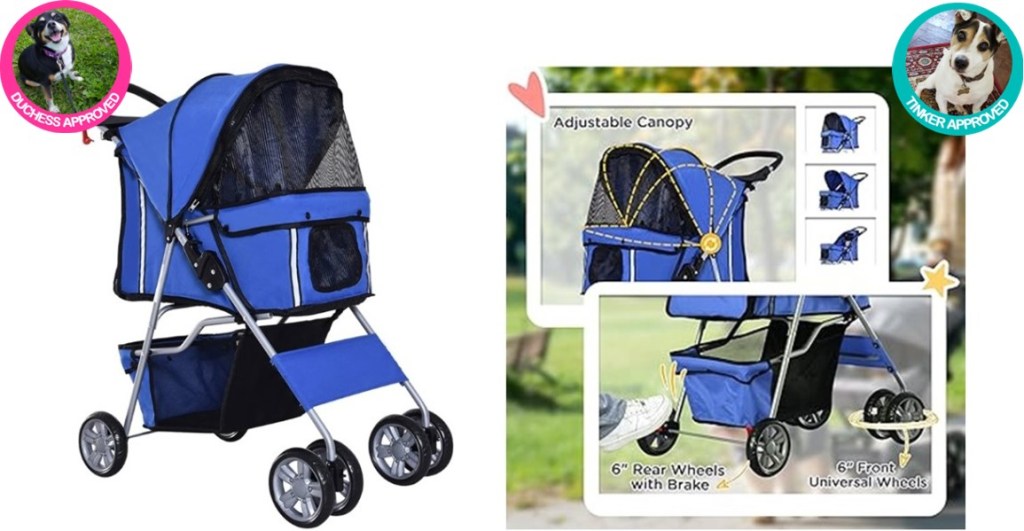 The PawHut Dog Stroller features solid sprayed steel frame with high-quality 600D Oxford cloth to prevent claws and biting right through, durable for long-lasting use. A bottom basket is included for convenient storage, and cup holders and tray on the handle for water and treats. Front universal wheels, and rear directional wheels with brake lever included for easy parking, as well as a safety leash inside to keep your pet securely strapped in. The frame has a folding design, which means it’s easy to store when not needed, and perfect for traveling by car.