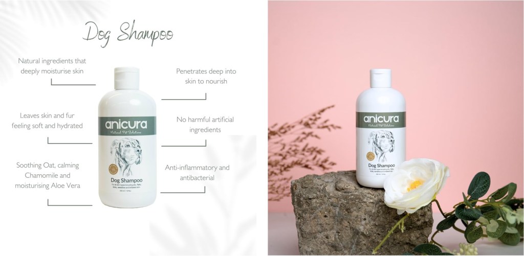 It’s always best to use a mild, paraben and sulphate-free shampoo that has been designed specifically for dogs, as their skin is generally thinner than human skin, and they have a more alkaline PH balance than humans. You may prefer one that is fragrance free or one that has naturally derived fragrance from essential oils. Ideally choose cruelty free products, and if you want to cut down on plastic pollution you can opt for a shampoo bar.